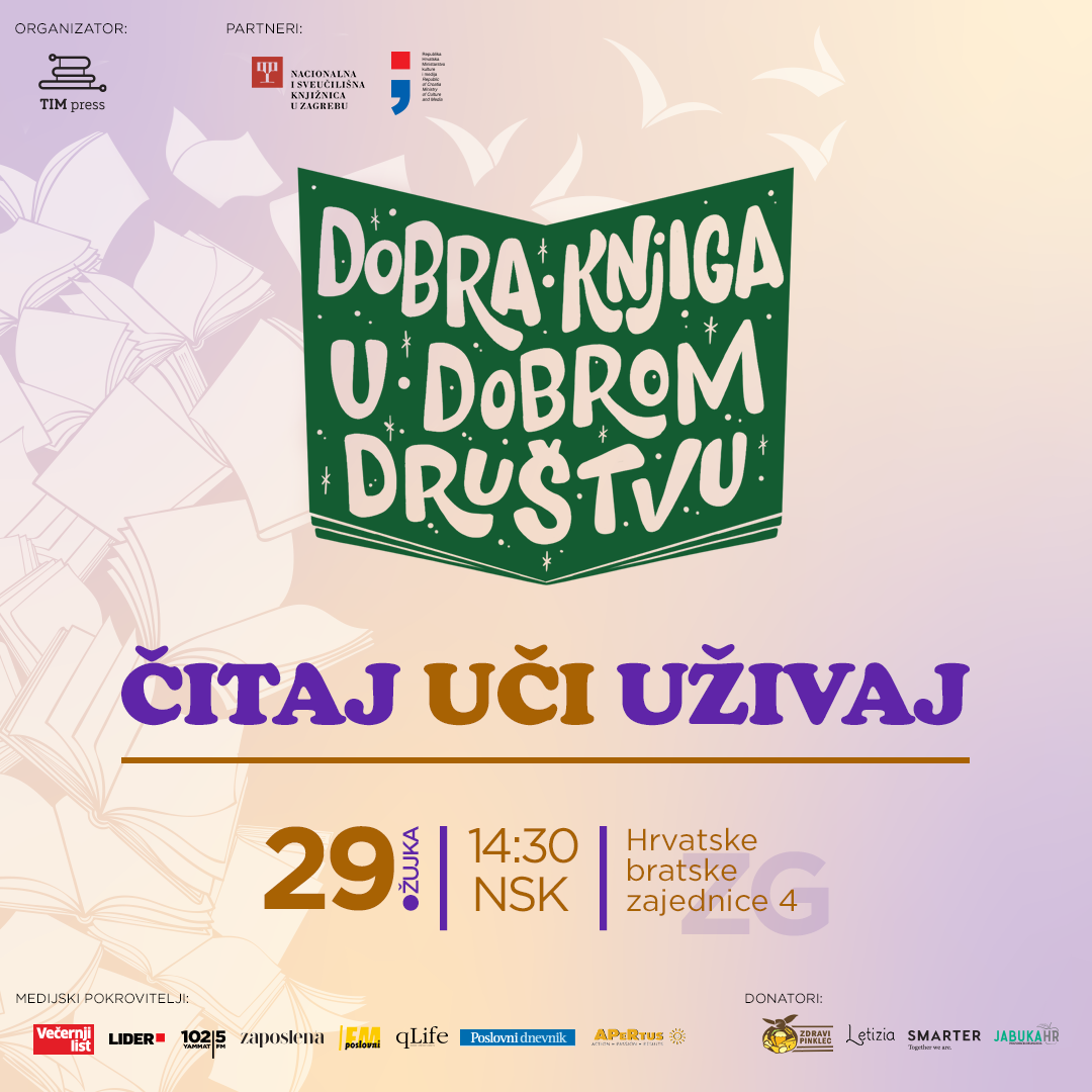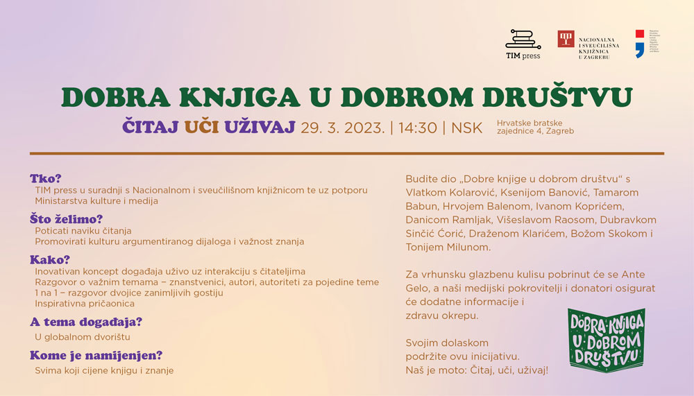 We invite you to the event "In a good bookompany", which will be held with the support of the Ministry of Culture and Media and the partnership of the National and University Library on Wednesday, March 29, 2023, starting at 2:30 p.m. at the National and University Library in Zagreb.
