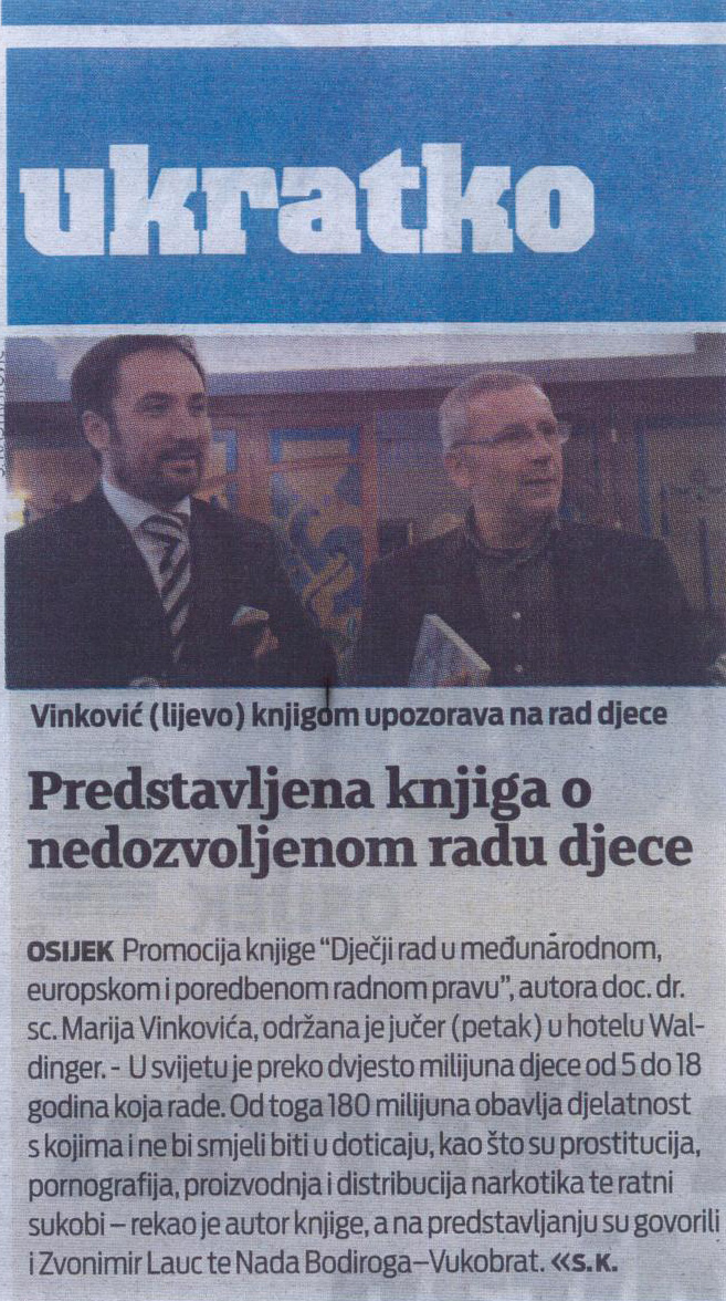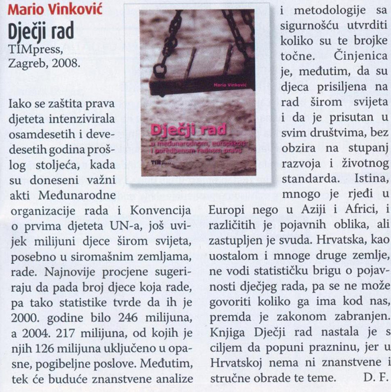 S obzirom da su nedopušteni oblici rada djece još uvijek relativno rašireni, dječji je rad važan ne samo sa stajališta radnog prava već i zaštite temeljnih ljudskih prava djece. Pri tome prava djece naročito ugrožavaju neka od teških oblika dječjeg rada, kao što su ropski i ropstvu sličan rad, prisilan rad te iskorištavanje dječjeg rada radi proizvodnje i prometa droga, prostitucije i sl. Na temelju provedenih istraživanja autor Mario Vinković je definirao osnovne pojmove u svezi s dječjim radom u međunarodnom pravu. Vodeći računa o pojavnim oblicima dječjeg rada i mogućnostima njegovog pravnom uređenja uspostavio je teoretski koherentan model koji omogućava razgraničenje dopuštenog i zabranjenog dječjeg rada. Razmotrio je i različite oblike prevencije dječjeg rada i otklanjanja štetnih posljedica toga rada. Knjiga Dječji rad u međunarodnom, europskom i poredbenom radnom pravu predstavlja značajni znanstveni doprinos pravnoj znanosti na području radnog prava. Utemeljuje teoretsku podlogu za praktično djelovanje nacionalnog zakonodavca i drugih koji se bave pitanjem eliminacije dječjeg rada. Djelo je namijenjeno širokom krugu pravnih stručnjaka i praktičara koji se bave problematikom radnopravnim standarda, zaštite prava djeteta i zapošljavanja malodobnika, ali i brojnim pitanjima funkcionalne zaštite djeteta i malodobnih radnika na nacionalnoj, europskoj i međunarodnoj razini.