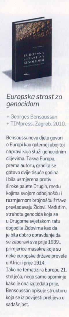 Bensoussanovo djelo Europska strast za genocidom – povijest genocidnih ideja i djela govori o Europi kao golemoj ubojitoj napravi koja služi genocidnim ciljevima. Takva Europa, prema autoru, gradila se gotovo dvije tisuće godina i bila je uperena protiv široke palete Drugih, među kojima svojom odbojnošću, kao i razmjernom brojnošću žrtava, prevladavaju Židovi. Autor analizira brojne događaje iz europske povijesti i traga za odgovorima zašto se mnogo toga iz povijesti prelijeva u sadašnjost; genocidnu strukturu on otkriva i u sadašnjosti, gdje je u latenciji. Struktura je uvijek ista, premda ovu potrebu za Drugim podmiruju i drugi, a ne samo Židovi. Knjiga je od iznimne važnosti jer se, kao što smatra Bensoussan, ljudi napajaju vjerovanjima prethodnih generacija pa je bitno napraviti svojevrsnu intelektualnu arheologiju užasa iz prethodnog stoljeća ne zbog toga da bismo si pripisali funkciju suca ili tužitelja, nego da bismo obavili onu zadaću koja bi trebala biti zadaćom svakog normalnog čovjeka.